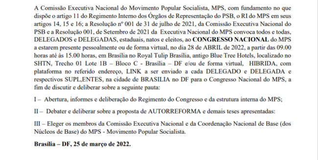 abr292025 Regimento Eleitoral dos congressos nacional, estaduais/distrital e municipais/zonais do Movimento Popular Socialista MPS / PSB.